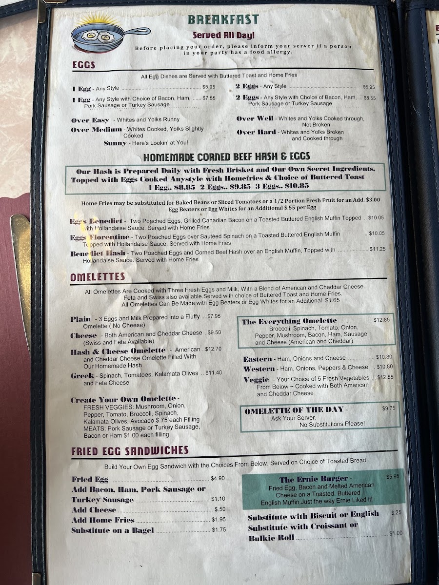The menu at 50's Diner is organized to accommodate a variety of meals throughout the day, with a focus on classic American diner fare. It includes several distinct sections: breakfast items, lunch entrees, and beverages.